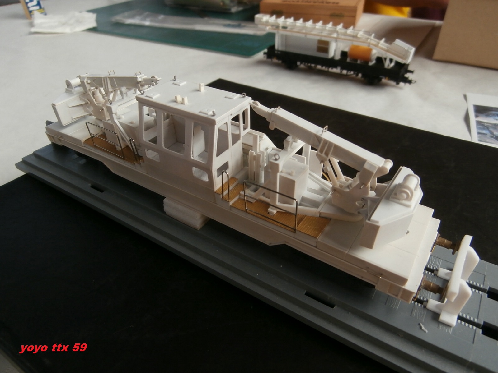 Tout d'abord merci Hervé d'avoir pris le temps de créer ce post pour moi, tu as entièrement raison de dire que je suis plus à l'aise avec le plastique et le cutter qu'avec l'ordinateur ou plus exactement la manipulation des photos :oops: :grrrr: merci Laurent et Bruno, pour répondre à la question, les grues peuvent simplement tourner sur la base, j'aurais pu permettre le coulissage de la flèche mais j'avoue avoir reculé en raison de la difficulté de blocage du coulisseau en position sortie, pour les vérins j'ai opté pour du fixe en raison du diamètre de ces dernier (1,5 mm) . A bientôt - Jean-Claude