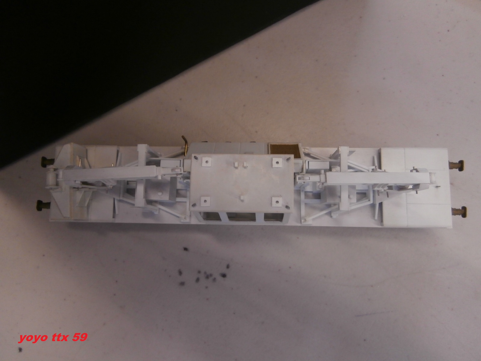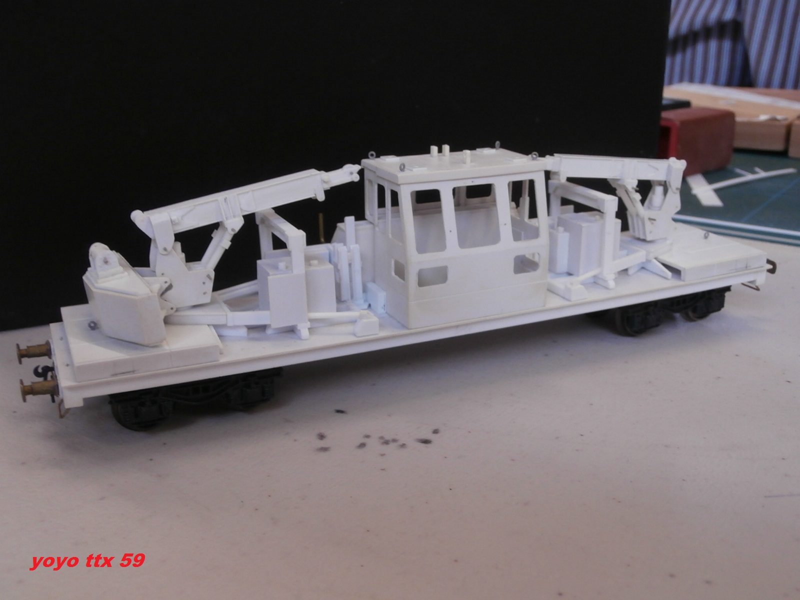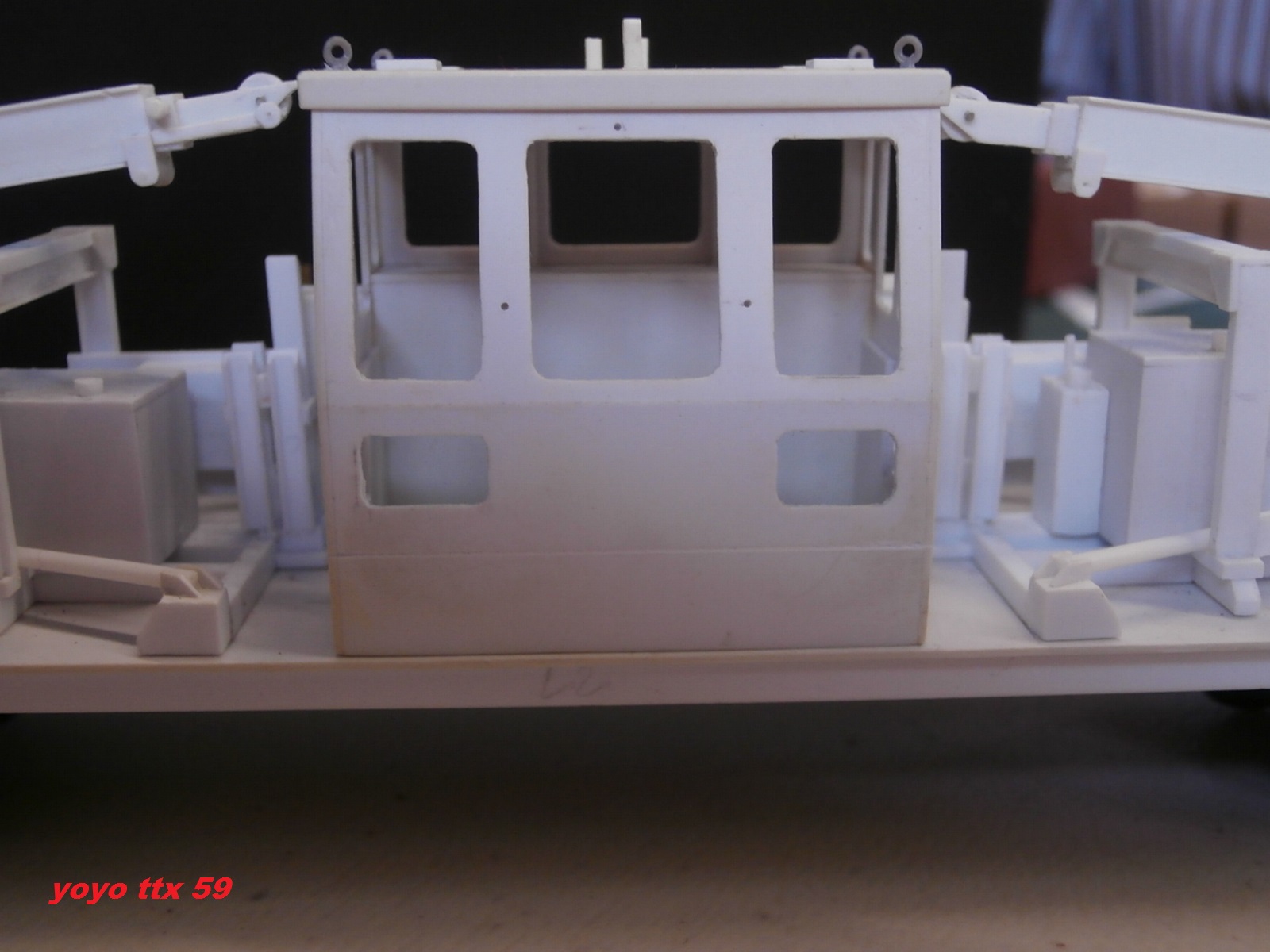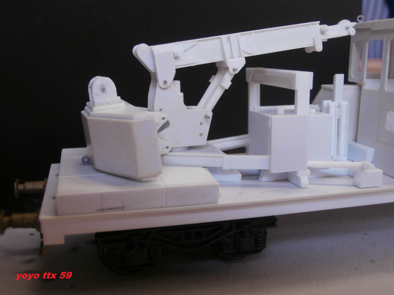 Merci. Il y aura évidemment un passage à la peinture dés que j'aurais complétement terminé les quelques détails manquants à savoir platelage, longerons latéraux de châssis, poignées diverses ,tuyauteries, fanaux etc.... pour cela l' ensemble a été conçu :grrrr: en une vingtaine de petits éléments pour faciliter la mise en peinture et ensuite la pose de flexibles hydrauliques(les plus visibles), crochets, câbles, aménagement cabine, vitres, essuie-glaces, phares de travail.... Voila, voila encore de quoi occuper quelques bons moments!