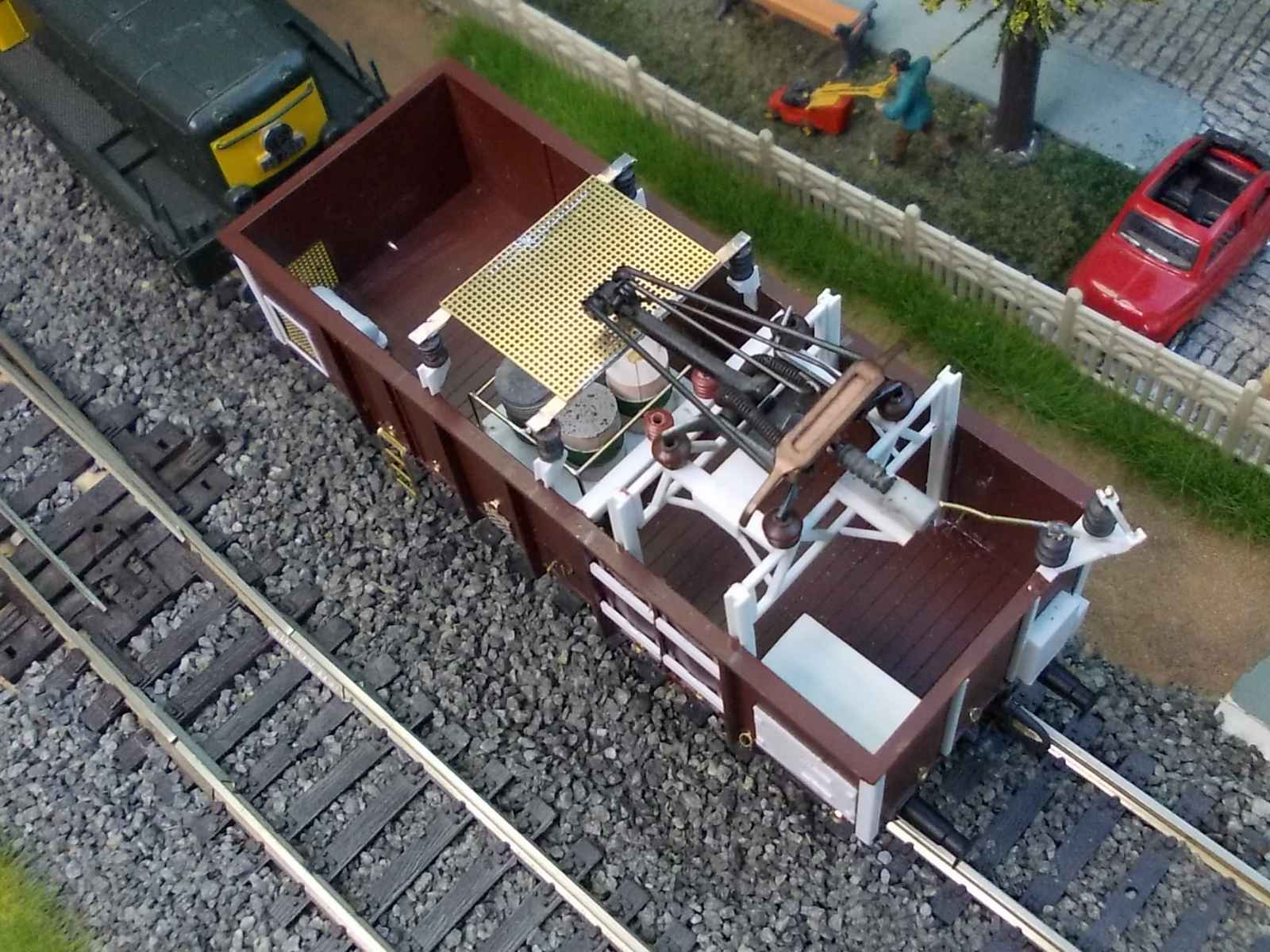 Modèle original reproduisant un wagon tombereau transformé en graisseur de caténaires du dépôt de Thionville dans les années 80.