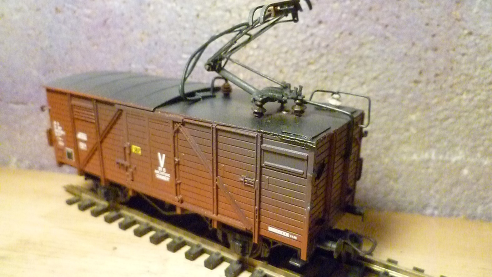 Voici quelques photos de ma dernière réalisation, un wagon graisseur de caténaires.Il s'agit d'une modification d'un wagon Roco, avec ajout d'un panto et d'isolateurs Sommerfedt. J'ai joué aussi sur les couleurs pour obtenir un effet "sali par la graisse" comme le wagon réel.