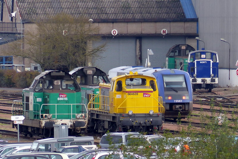 Voici la 664639 ex 63768 à la sortie Nord du dépôt de Saint Pierre des Corps avec les 9247 et 22304 HS