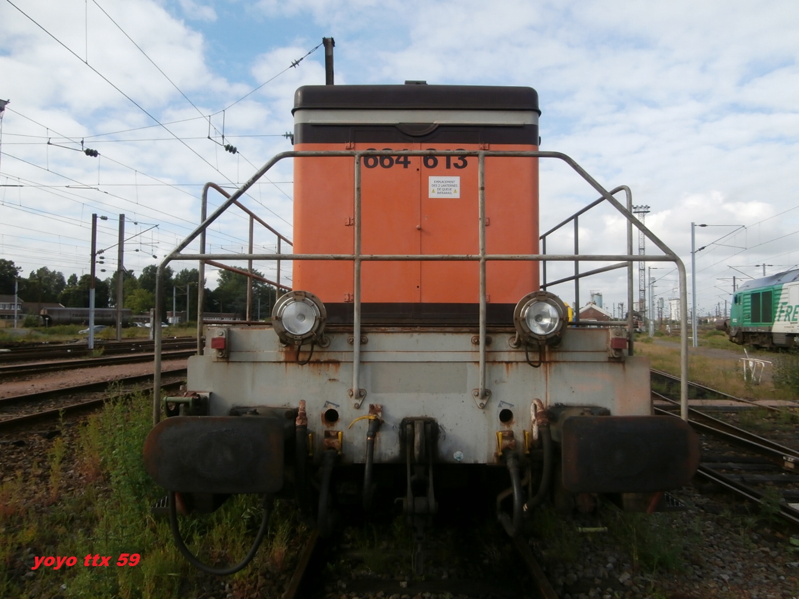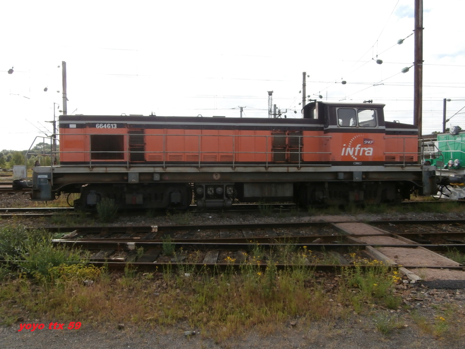 Voici la 664613 Infra en livrée Arzens avec son train désherbeur à Saint Pierre des Corps lundi 10 mars 2014