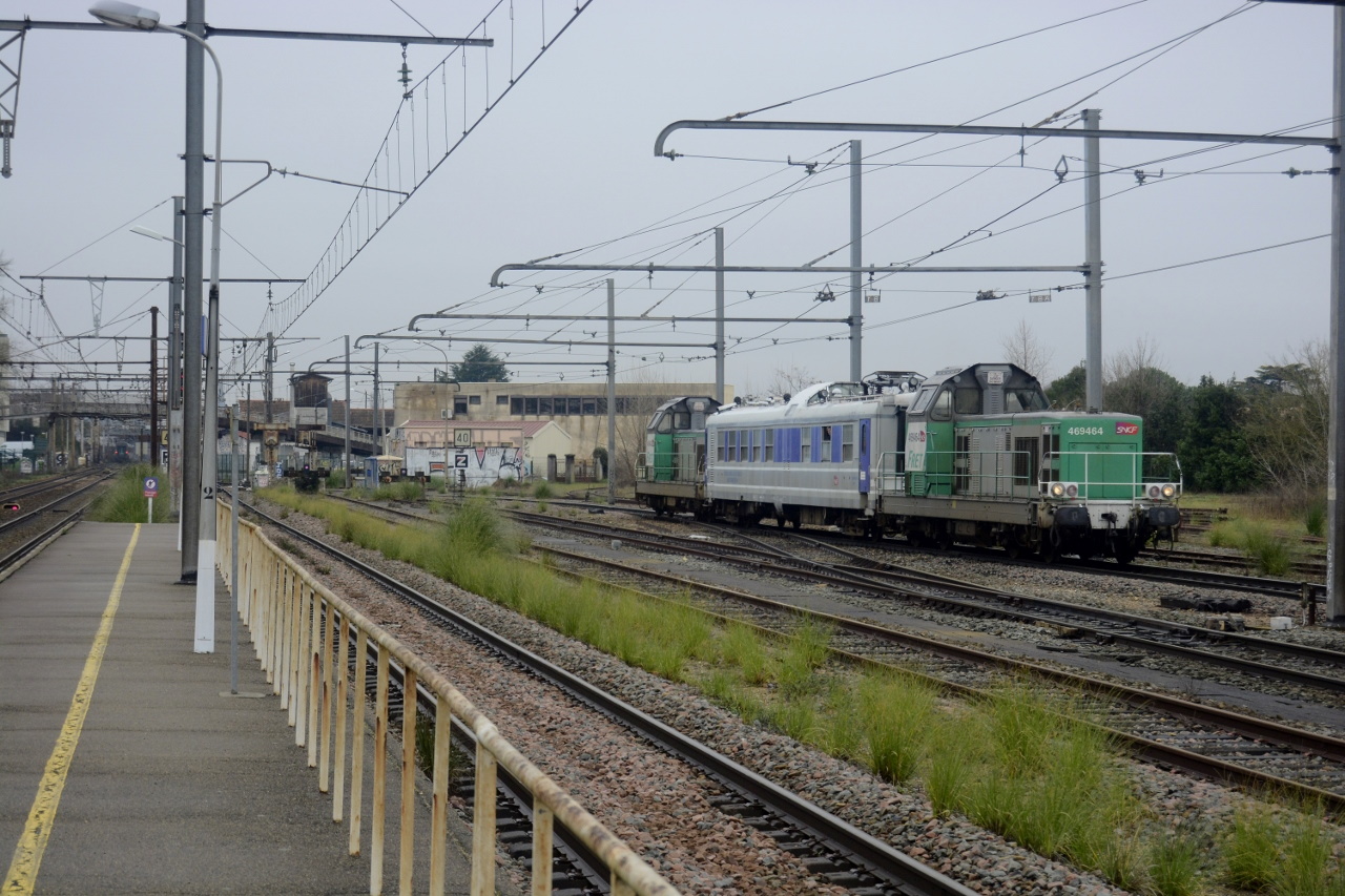 Voici la 469464 Infra pas de logo en livrée Fret (ex 66464 mise en service le 12-04-1970) sur un train Mauzin