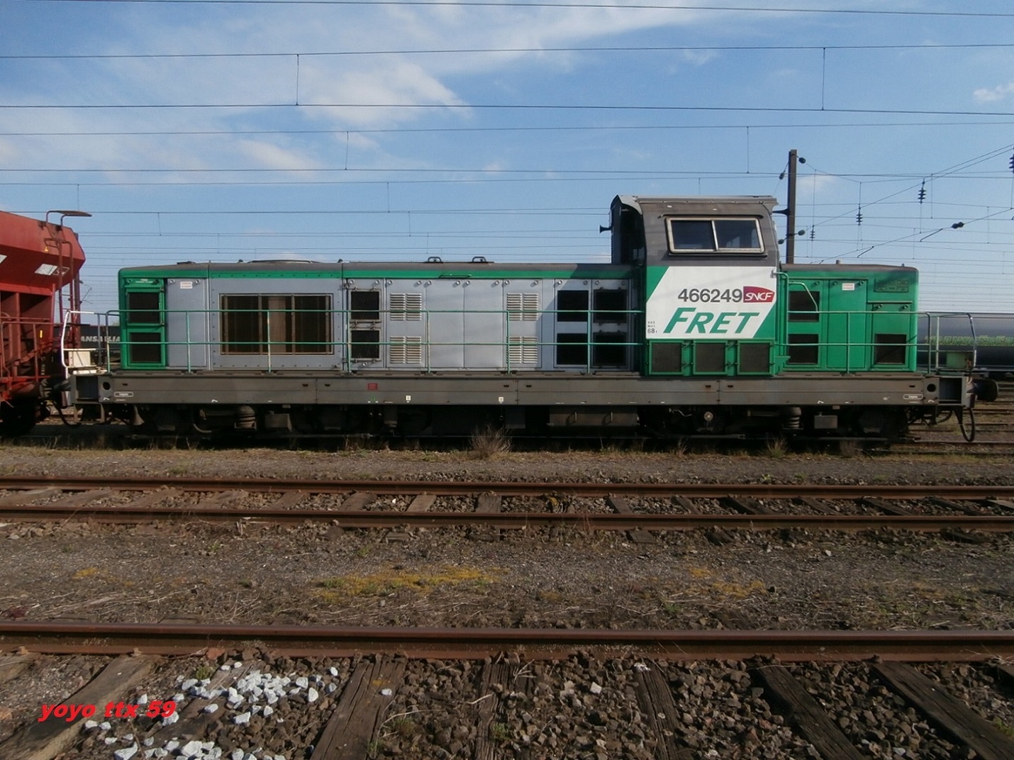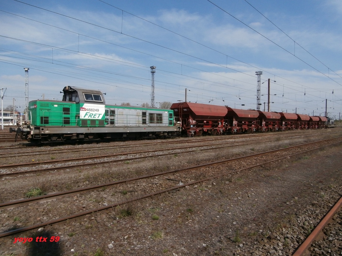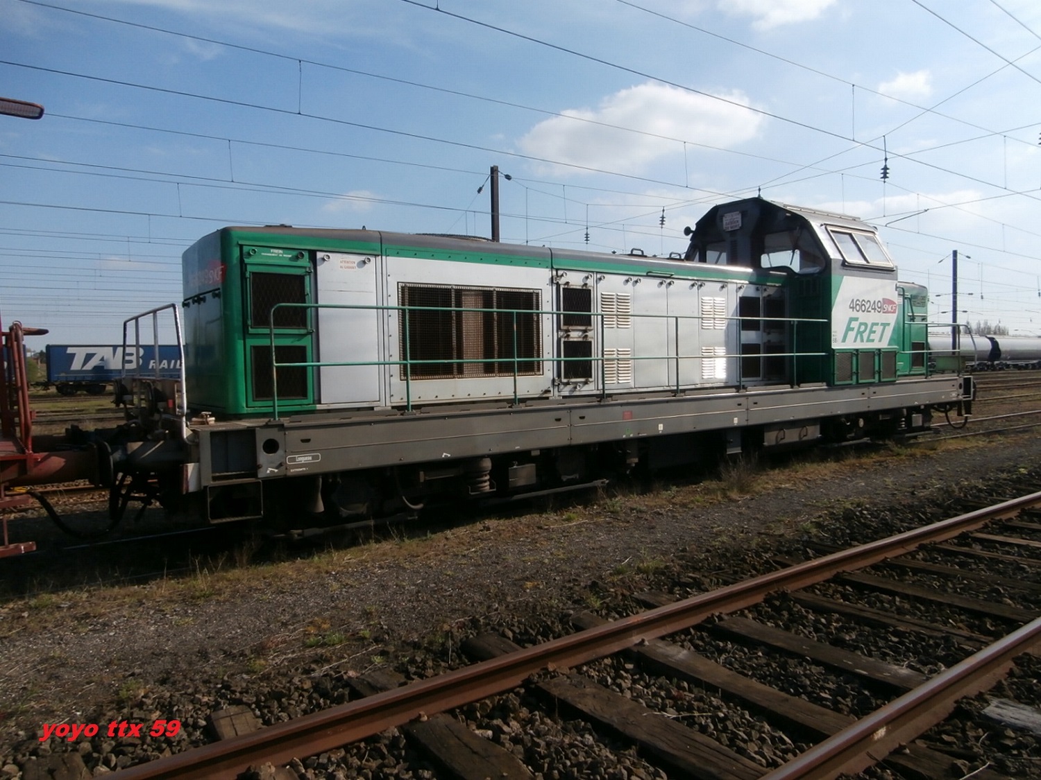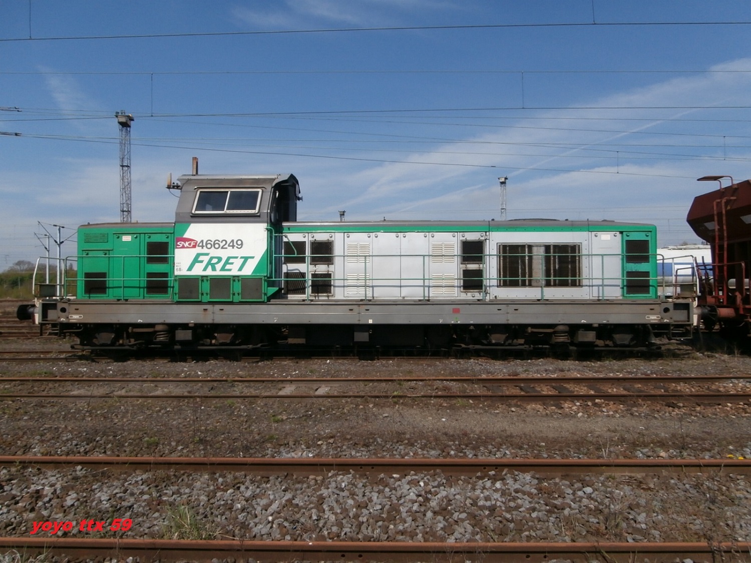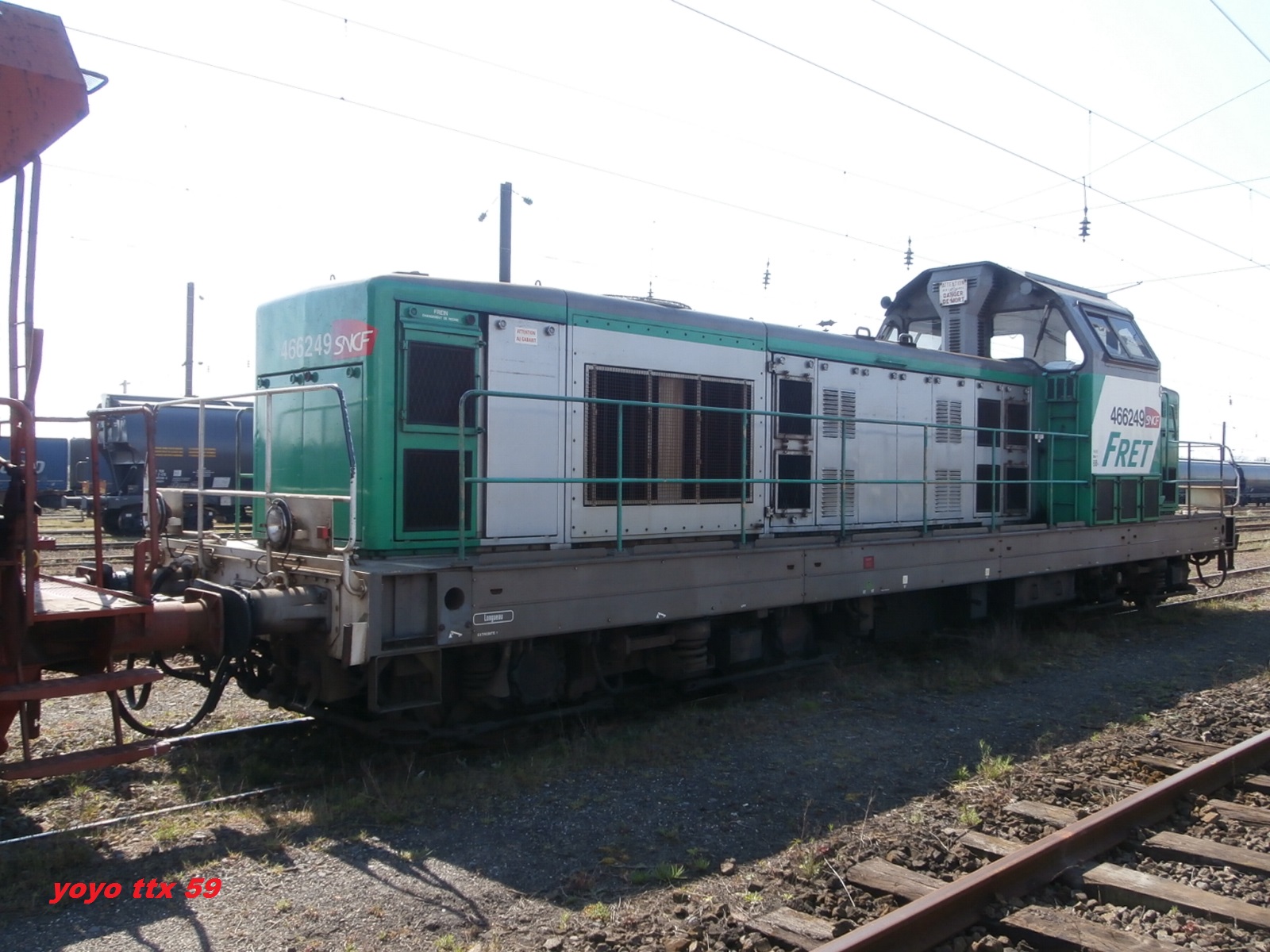Voici la 466249 Infra en livrée Fret (mise en service le 15-07-1966) en véhicule sur une rame Infra avec la 667624 en tête