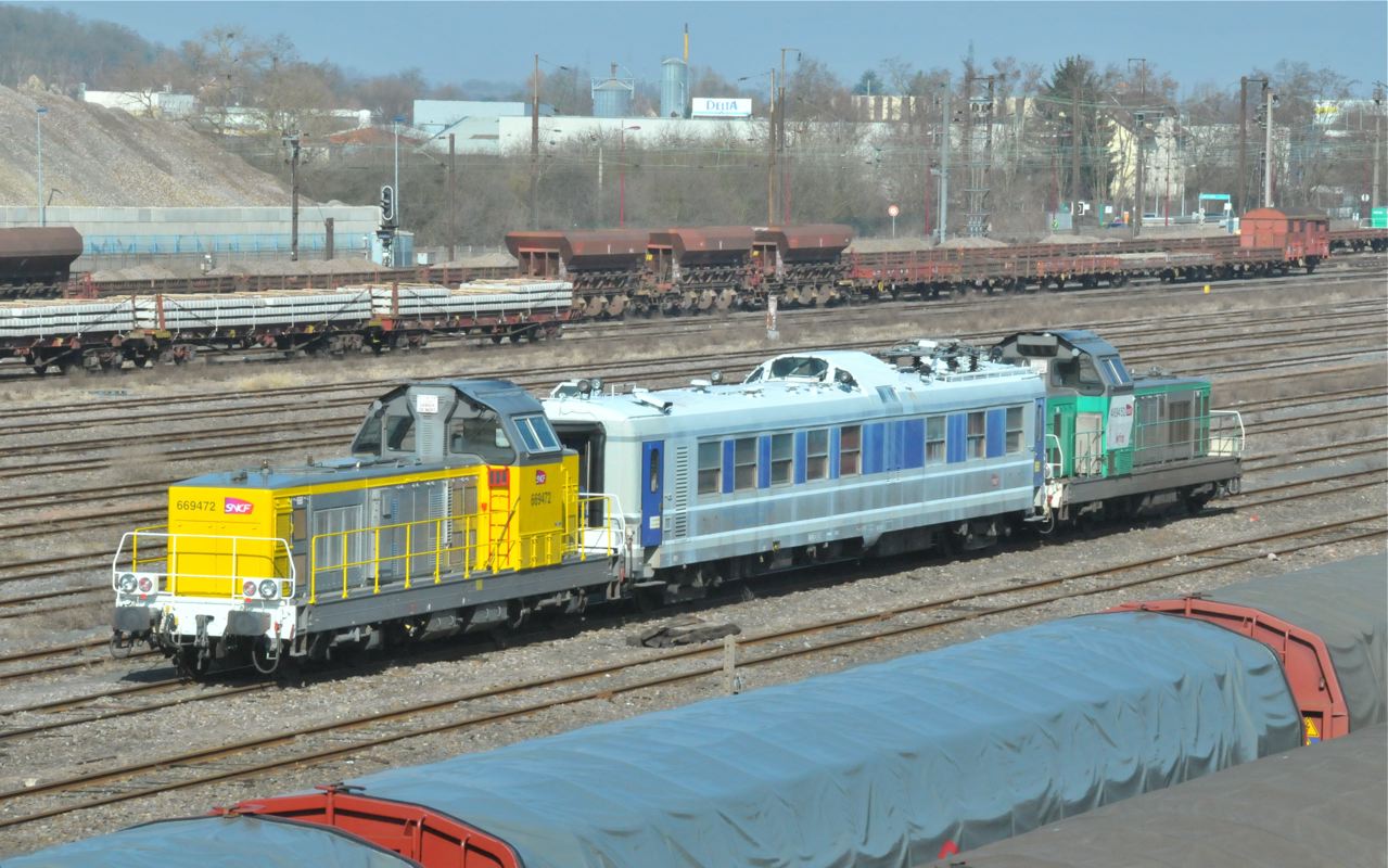 composition de la rame : 669472 + Automoteur V5 - 9.601 - SNCF-PN "Venus" + 469446 Infra Livrée Fert