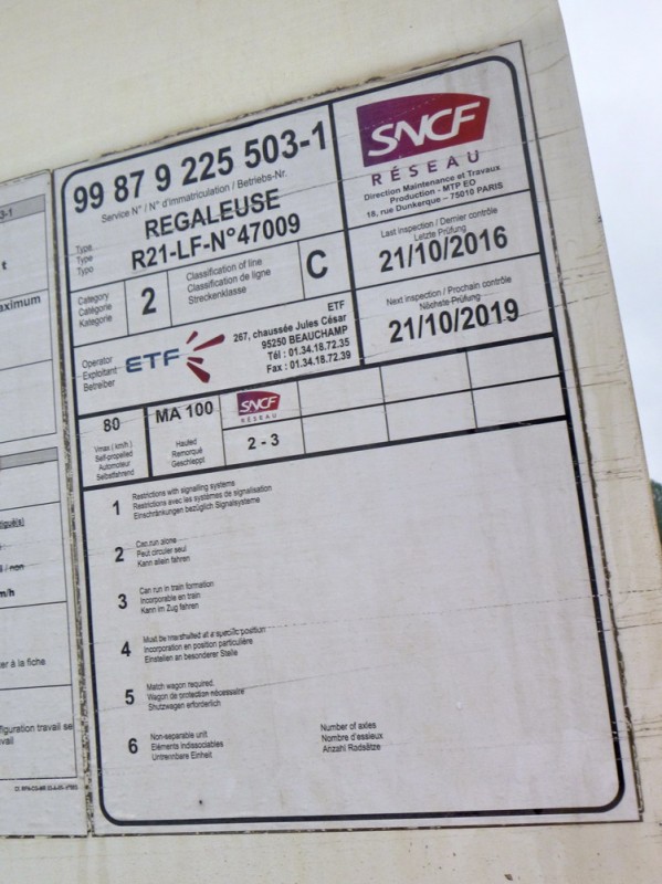 La voici avec la nouvelle livrée blanche d'ETF (Régaleuse n°47009 Matisa 09-1995) Agrément IVM 00 033 - 18-09-2013/2016