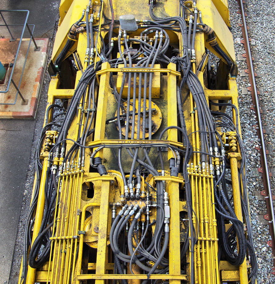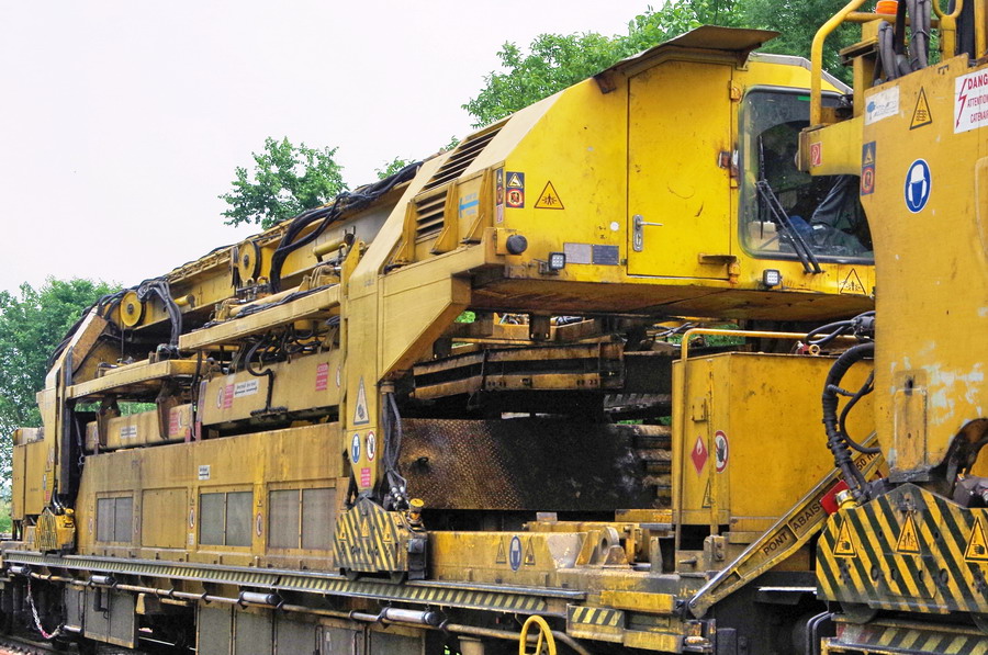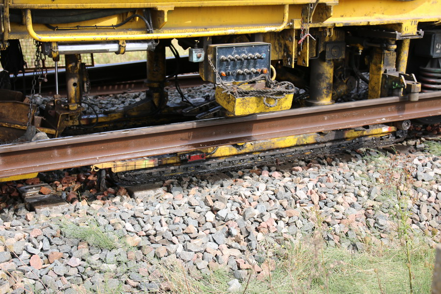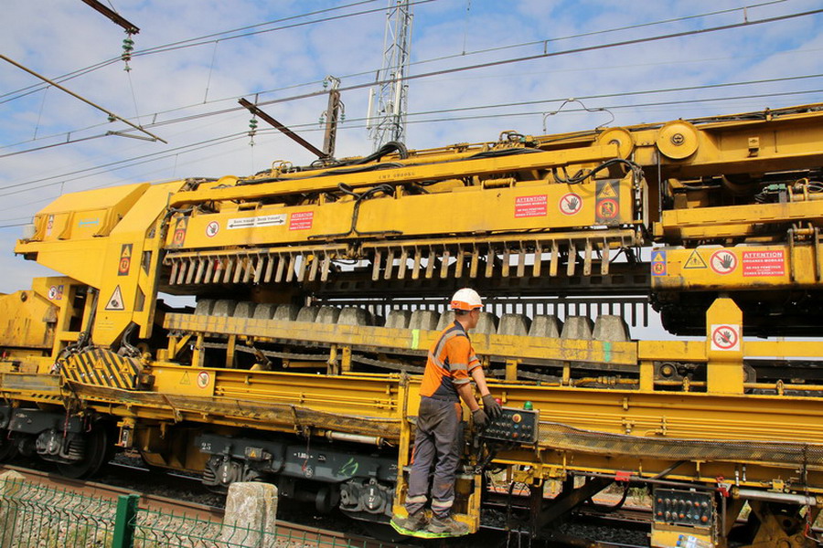 . wagon 5 WF - force avec poutre : évacuation du ballast, enlèvement des anciens rails et pose de nouveaux longs rails soudés