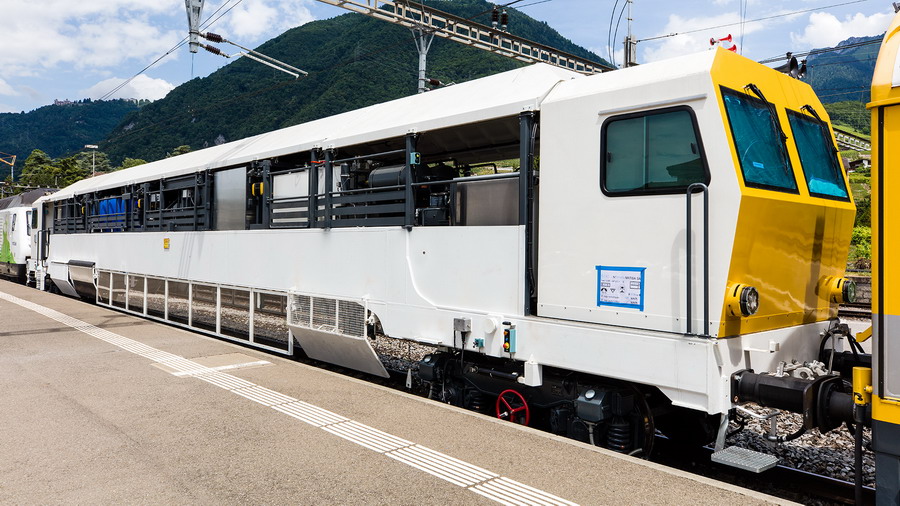 Voici le wagon JICAD de passage en gare de Villeneuve dans le canton de Vaud sur la ligne Lausanne à Brig