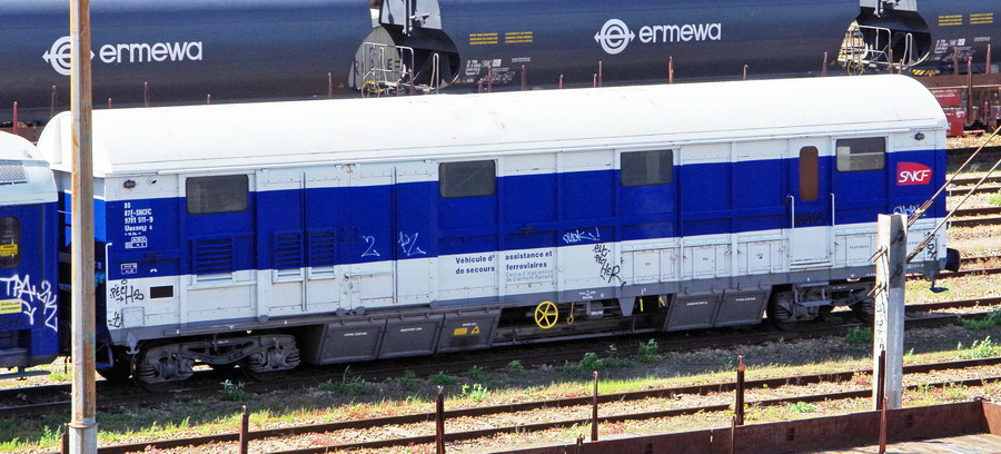 Voici le wagon couvert à boggies 80 87 979 1 511-9 Uass H52 6 SNCF-CF véhicule d'assistance et de secours ferroviaires