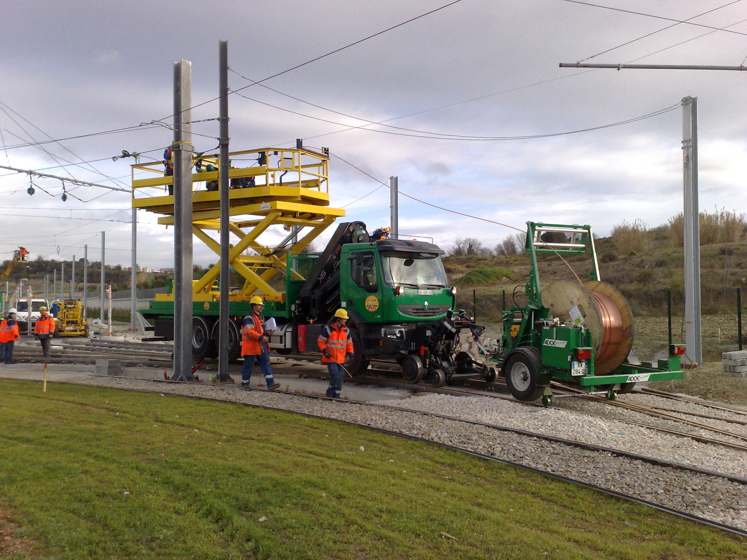 Pour ce qui est du déroulage, c'est pas top du fait de la grosse tension radial sur la plateforme, parfois ingérable dans les courbes :carton: . Une pelle rail-route à contrario permet un déroulage en tension constante et permet de poser votre contact dans les poulies ou l'apporter directement au poteau pour les fins de tire.