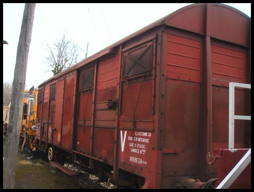 Voici une photo d'un wagon couvert SNCF, classique qui accompagne tous les engins de maintenance des infrastructures du type bourreuses, SNCF.