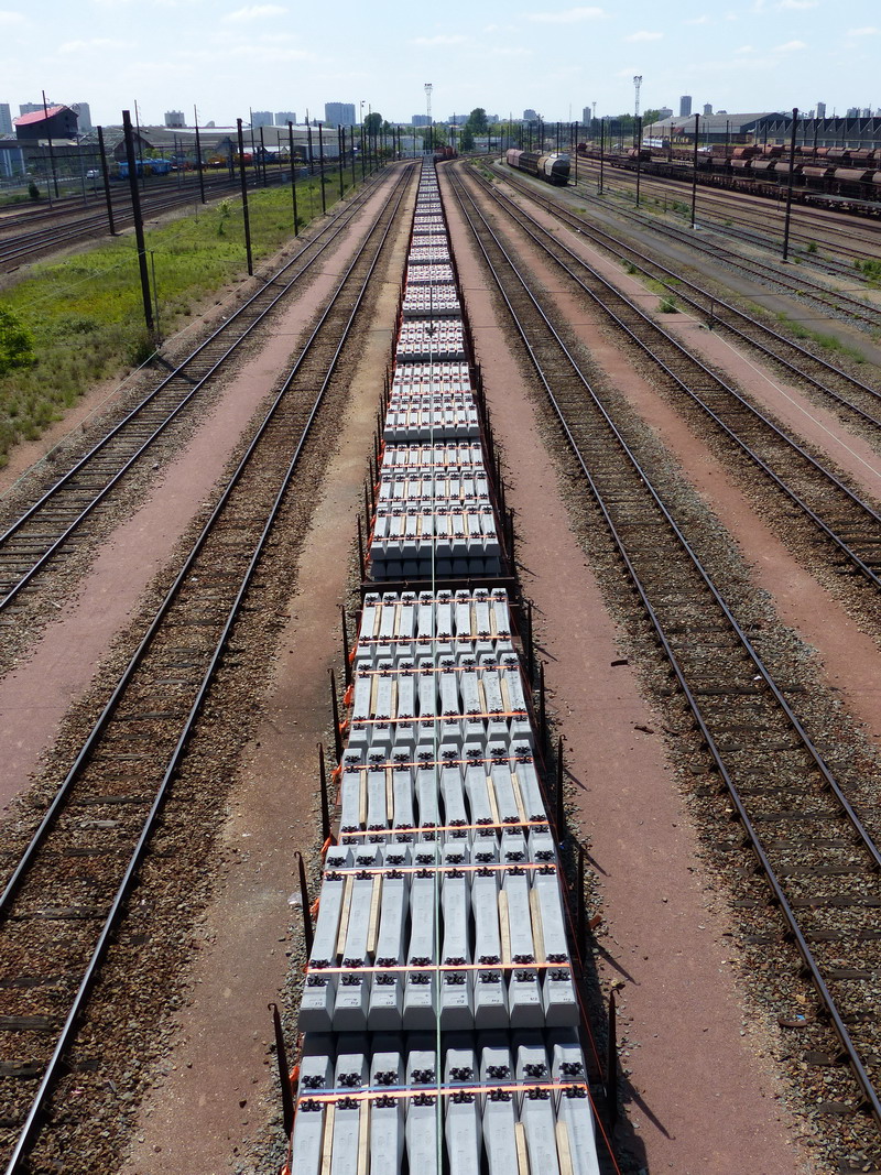 Avec une rame Italienne de wagons plats à boggies Rgs I-TI chargement de traverses béton
