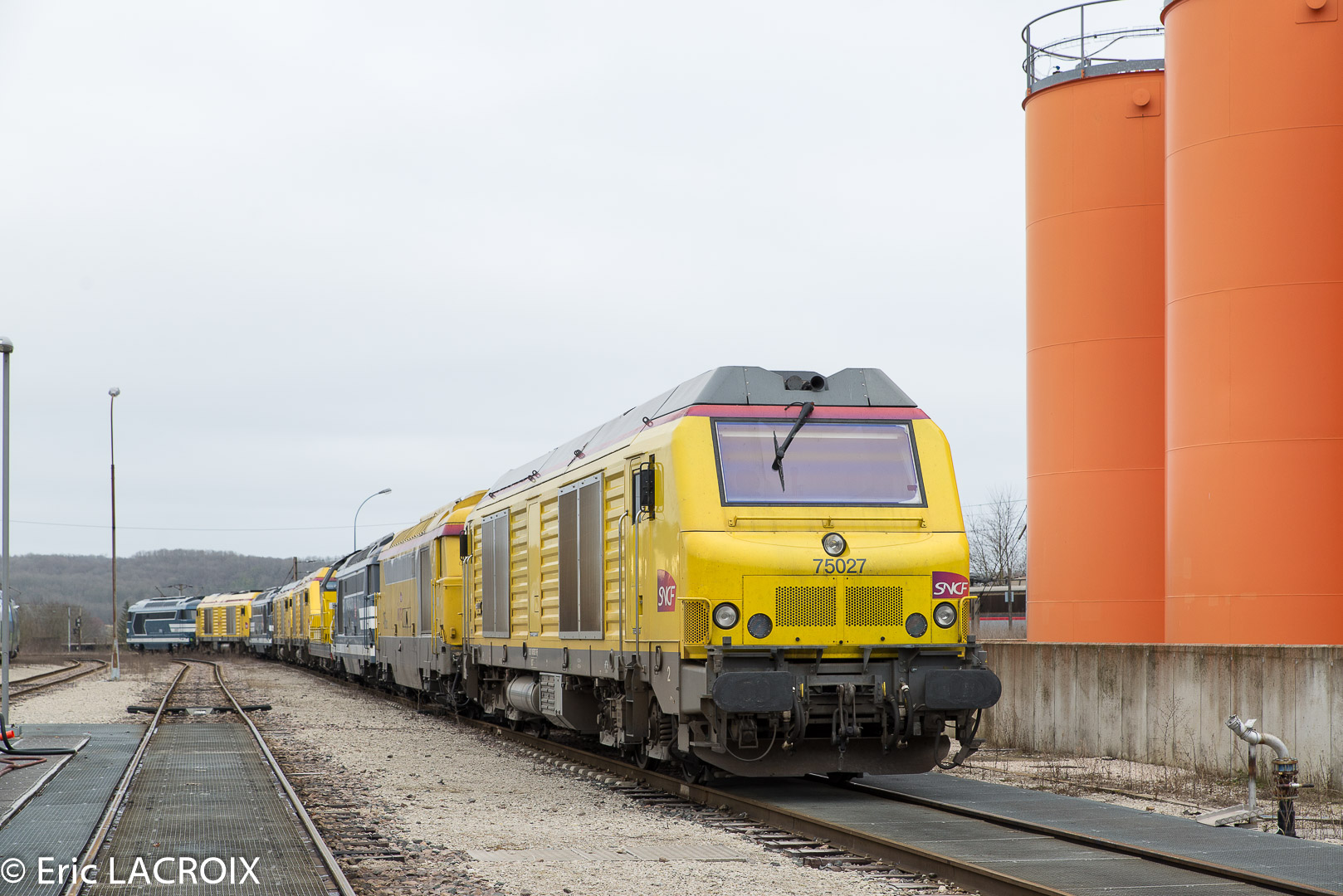 Vue hier au dépôt d'Achères, la BB 75027 vient de se voir appliquer une livrée jaune.