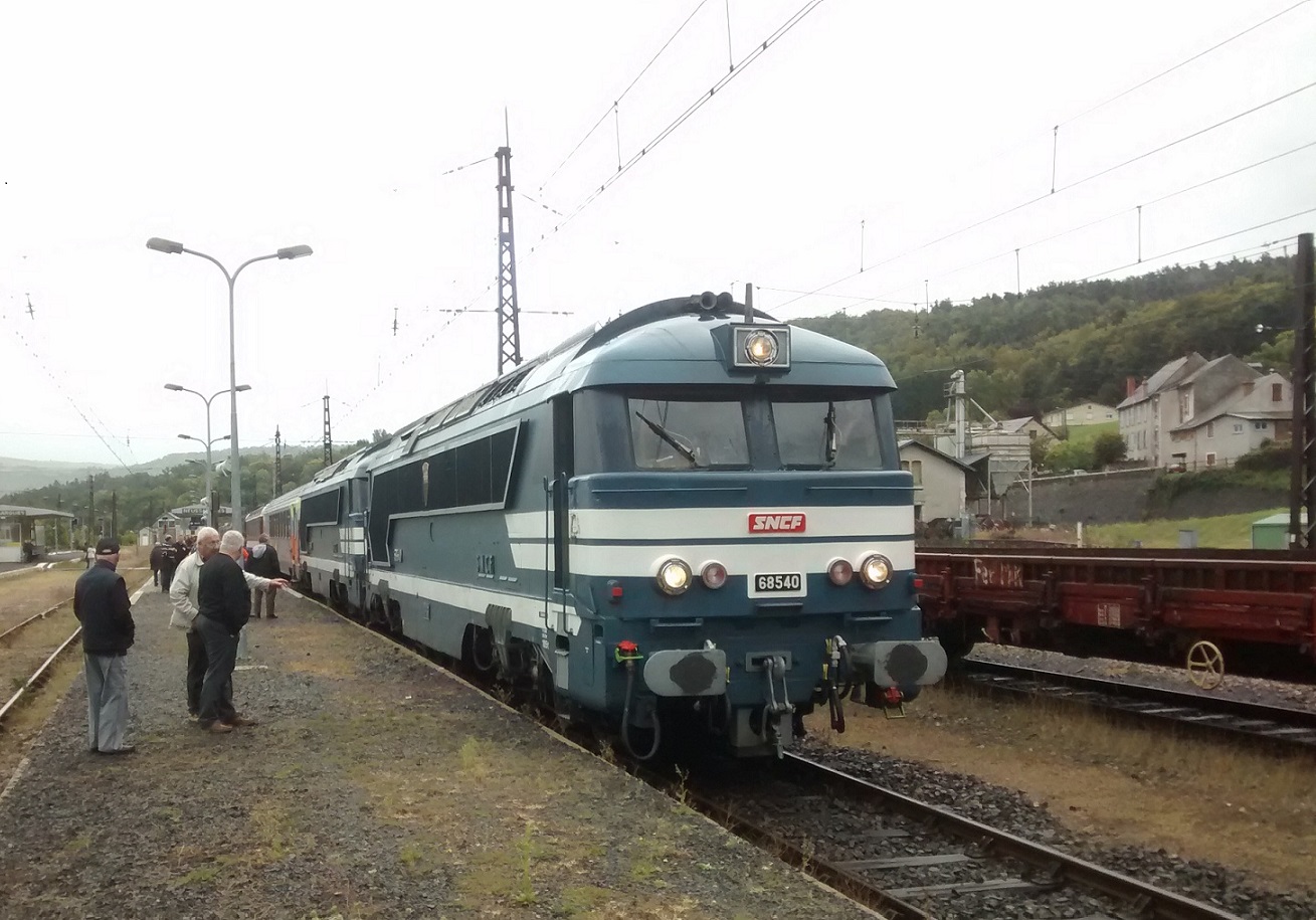 Photo prise à Neussargues en octobre 2015 avec la 68081 en UM prêtée par la Cellule des Matériels Radiés de la SNCF, sur le train croisière Orléans - St Chély.