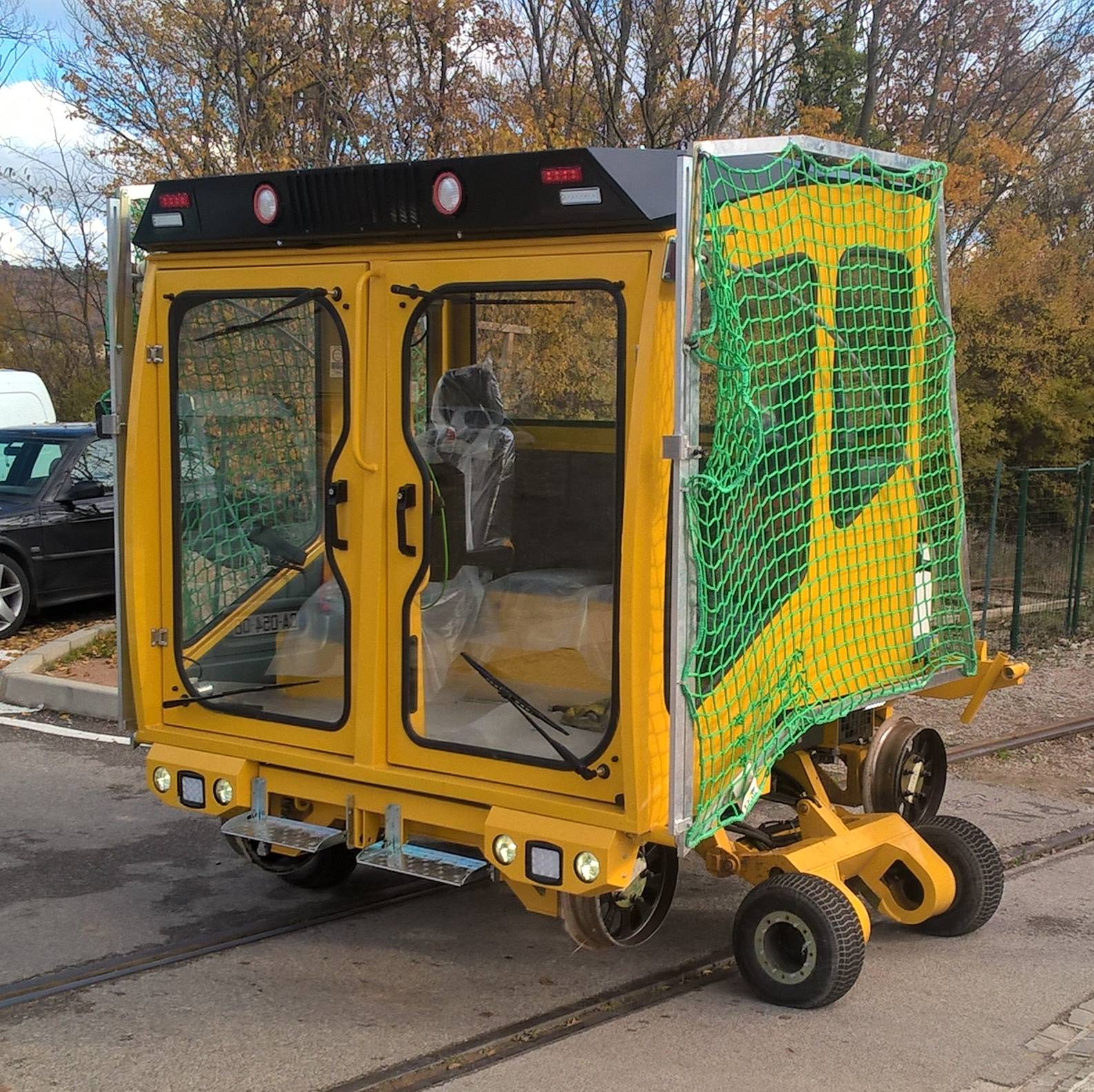 Sur les flancs, une cage rotative qui protège l'équipage de la voie contigüe lorsqu'il sort de la cabine pour faire une inspection en voie (par exemple, mesure d'un défaut de rail à la règle)
