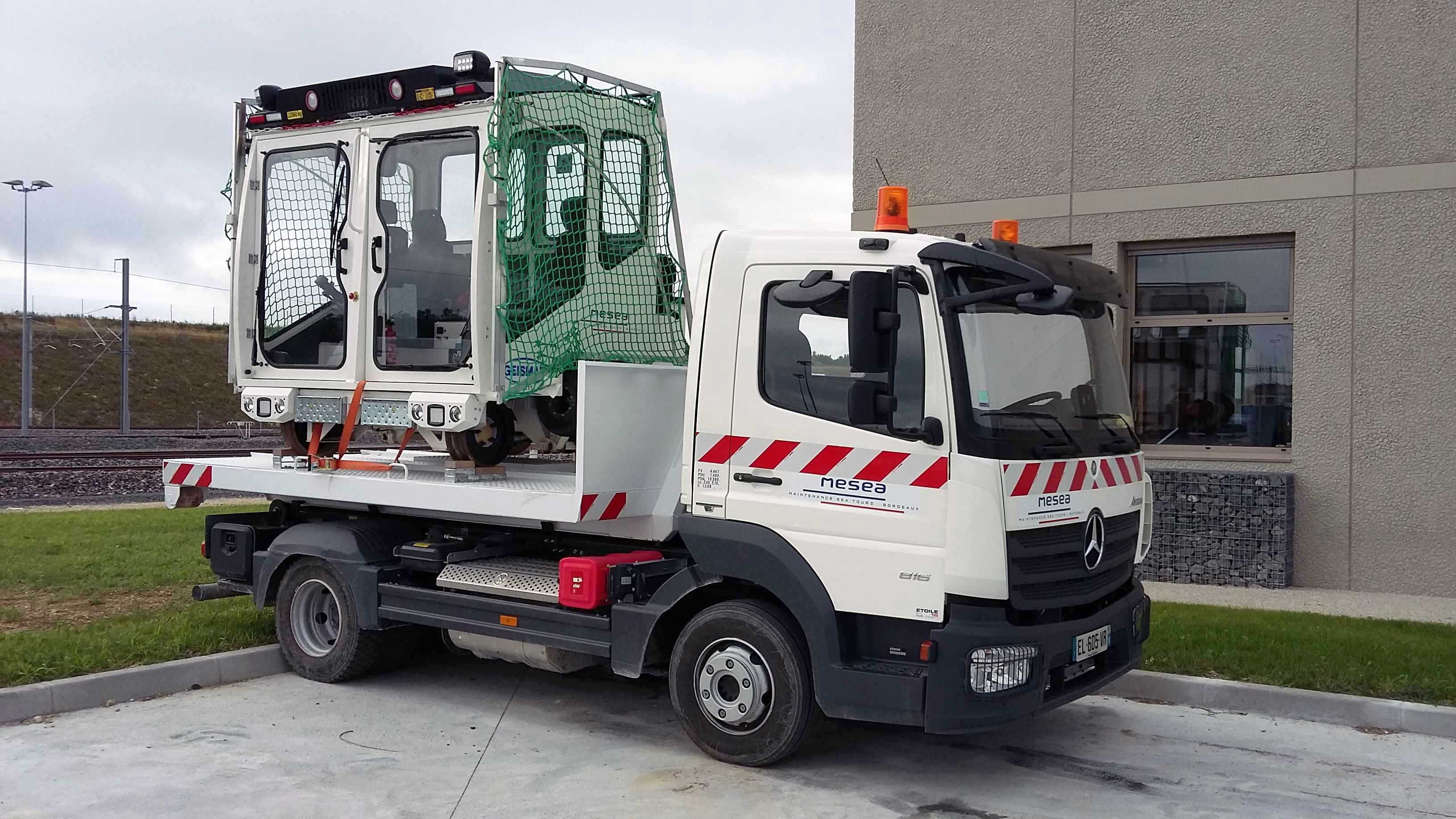 Voici les camions porteurs Mercedes MESEA 7,5 t utilisés pour véhiculer les lorries en ligne. Ce sont des camions équipés ampliroll qui posent/déposent des berces au sol. Une berce spéciale a été réalisée pour le transport des lorries Fasseta.