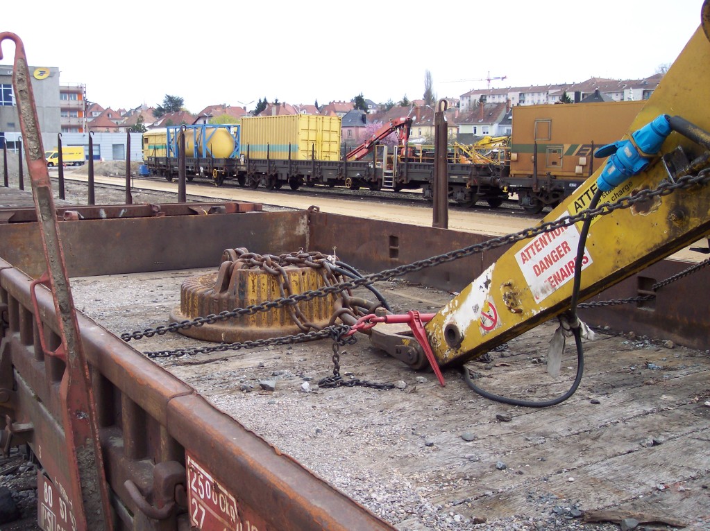 au pied de la grue, on voit des C ( couleur jaune/ marron). ça sert à attacher les eclisses provisoires lors des RVB. C'est les betes noires des bourreurs car on ne les voit pas quant ils sont recouverts de ballast et des fois ils ne sont pas rangés le long des traverses. :x