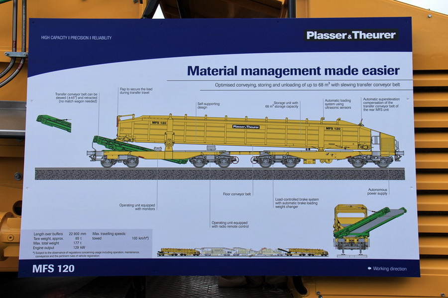 Le nouveau MFS 120 offre des capacités de transport, de stockage et de déchargement optimisés pour une capacité de 68 m³, et est compatible avec les véhicules existants. Une nouvelle configuration de la trémie et un agencement repensé des bogies assurent une meilleure répartition de la charge. La construction autoporteuse réduit la masse totale. Le MFS 120 permet ainsi de charger environ 110 tonnes de ballast. Avec ses quatre bogies à deux essieux chacun, il est tout de même autorisé à la circulation sur toutes les lignes, y compris de la catégorie C2.