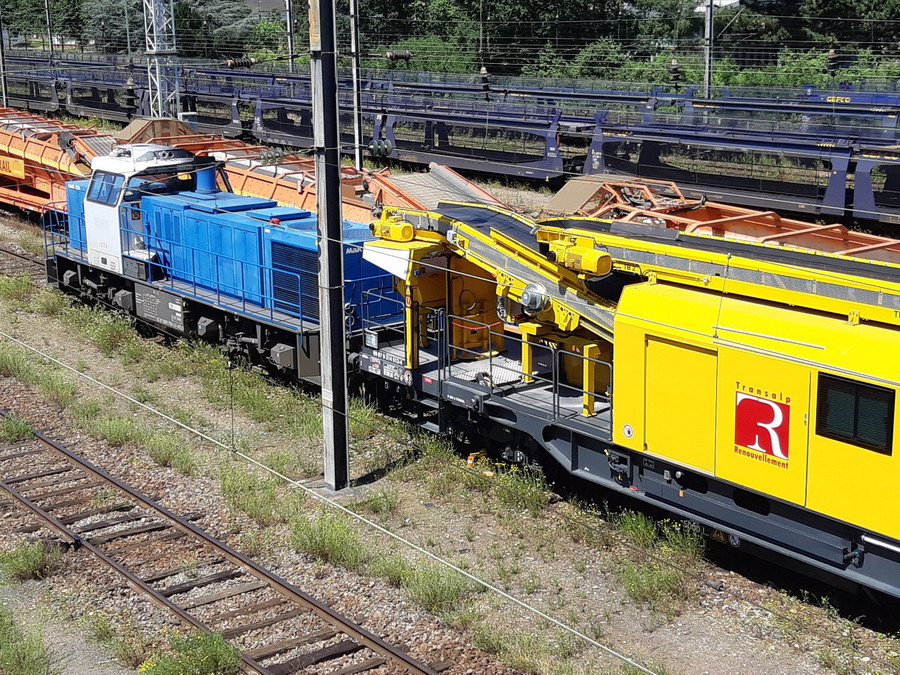Voici l'élément C75 - 2C de la Dègarnisseuse de Transalp Renouvellement dans le triage de Mulhouse Nord le 20 juin 2018 arrivant de Suisse