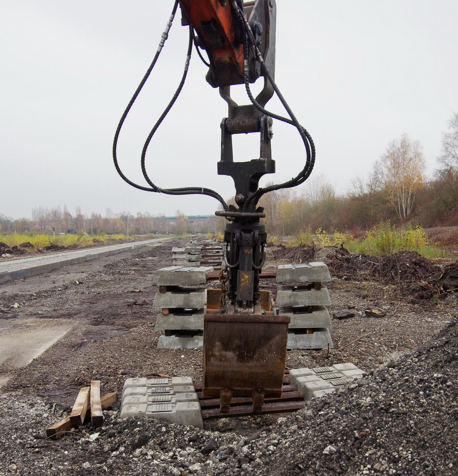 mise en place des traverses bibloc neuves avec la Pelle Rail route Case 788 PRR n° CGG0229077 Colas Rail F 6200036 sur le site de travaux de Longueau le 26-11-2018