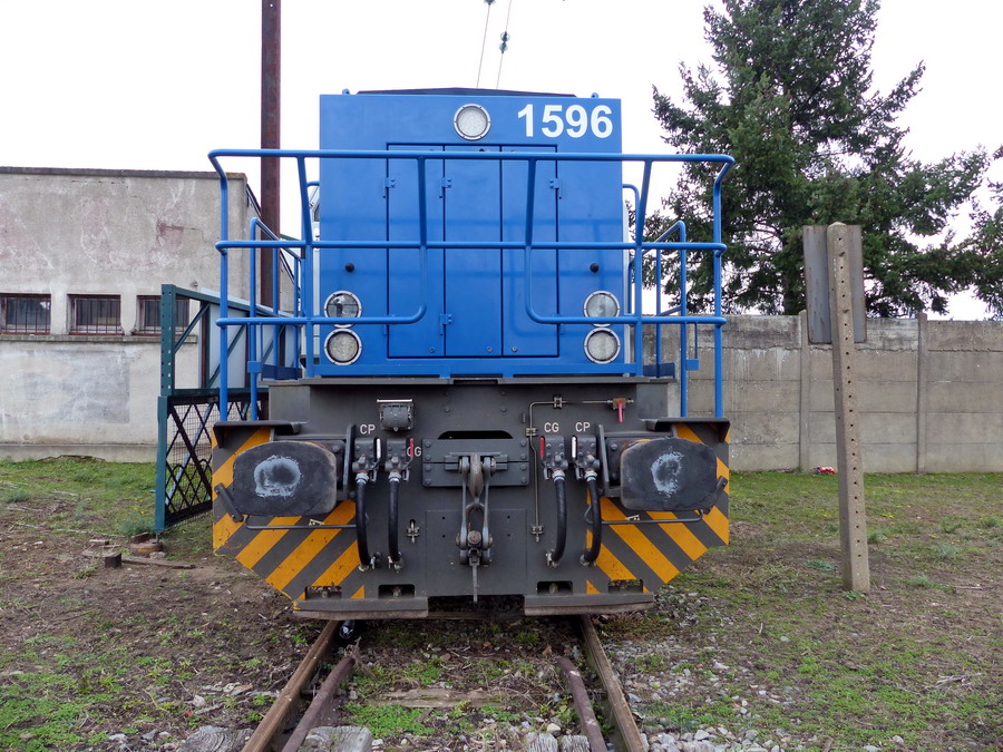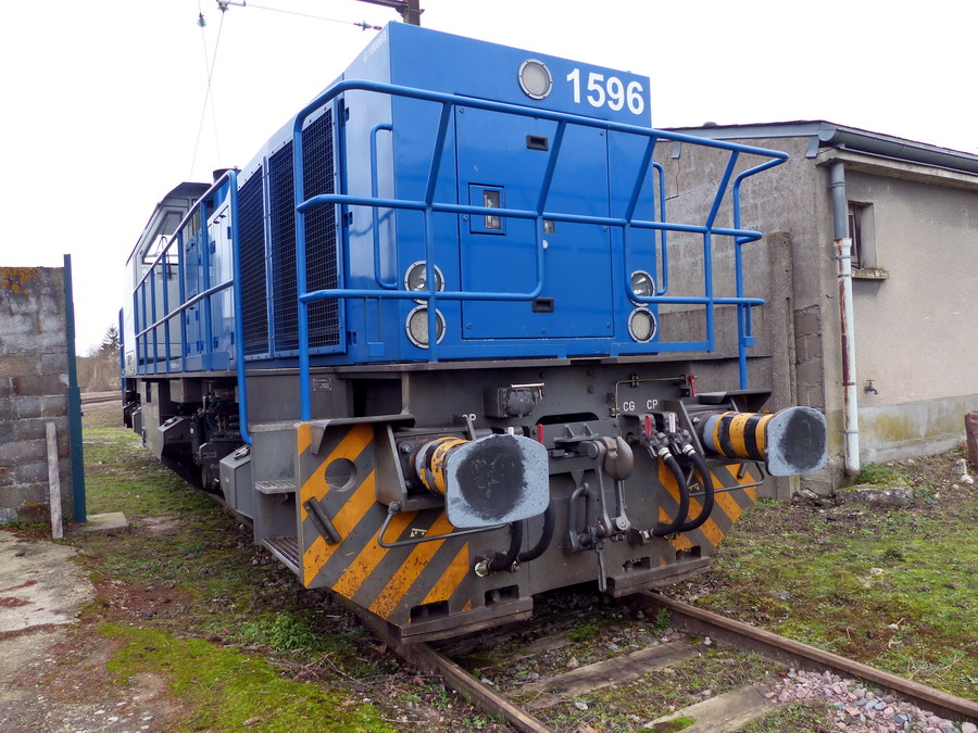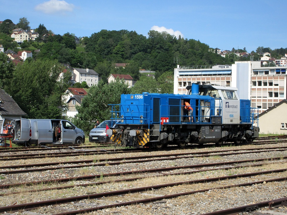Ce jeudi 3 juin 2021 en fin de matinée, la machine 1596 en livrée bleue et cabine blanche (n° 92 87 0 001 032 7) était sur le faisceau de Tulle (Corrèze) attelée sur une rame de wagons Uas (plats à bogies) chargés de longs rails.
