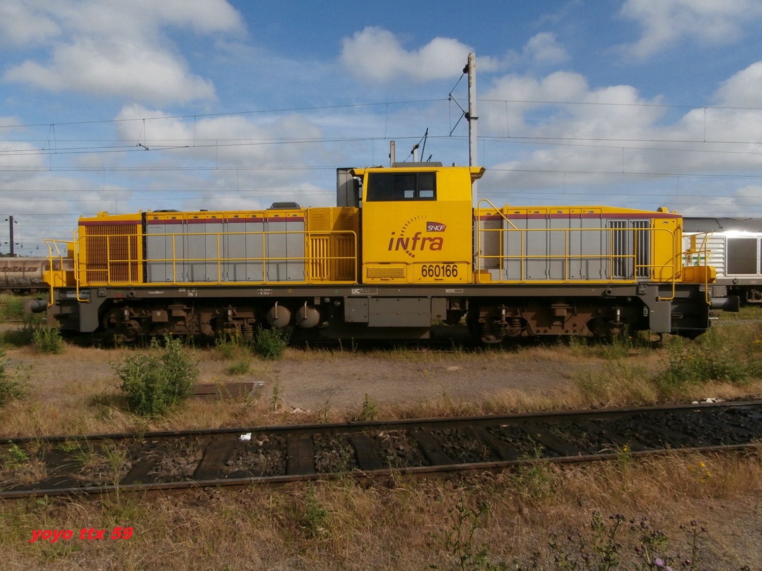 La 660166 avec le locotracteur Y 9010 en tête, sortie de dépôt pour la zone ouest du garage des rames Infra/SNCF